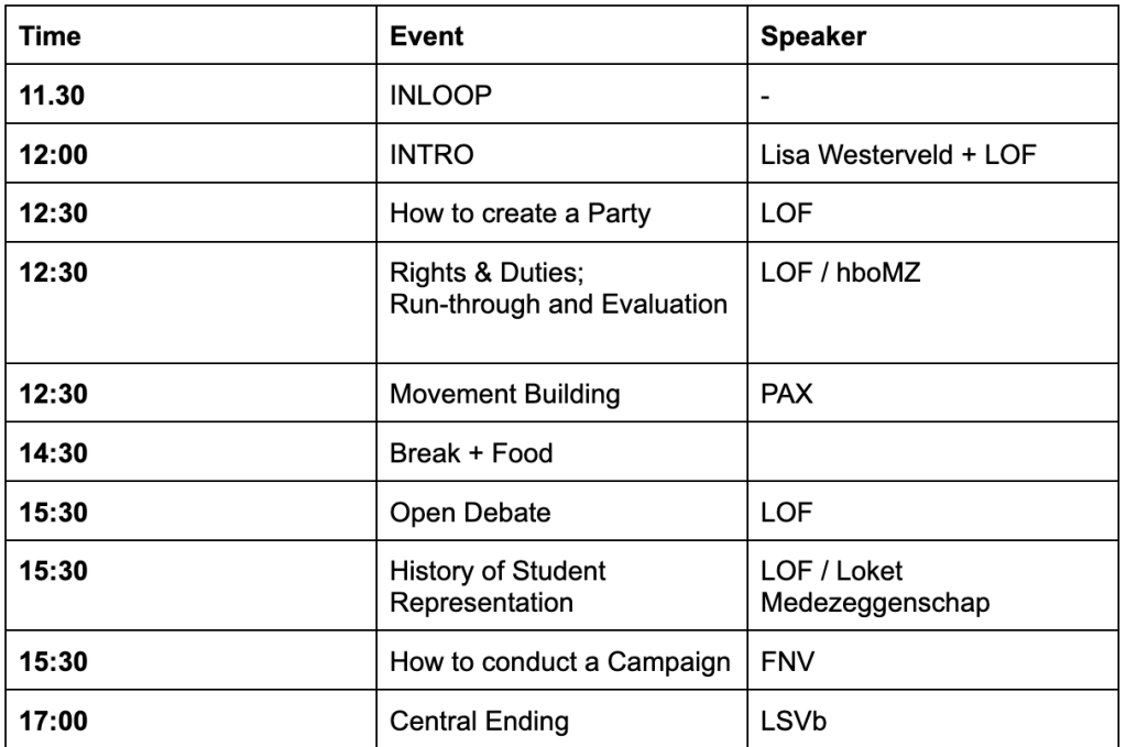 During the session, we will have a diverse program featuring training sessions, discussions, and opportunities to connect with other students from the entire country! This will mostly focus on how to strengthen and democratize the university further. Our speakers include Politician Lisa Westerveld, FNV Board members and LSVb board members!